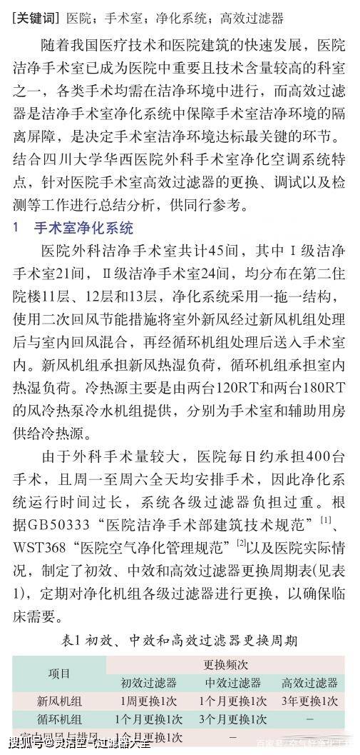随着我国医疗技术和医院建筑的快速发展,医院洁净手术室已成为医院中重要且技术含量较高的科室之一,各类手术均需在洁净环境中进行,而高效过滤器是洁净手术室净化系统中保障手术室洁净环境的隔离屏障,是决定手术室洁净环境达标最关键的环节。