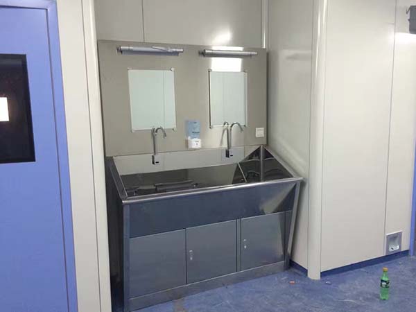 灵洁公司设计的医用不锈钢洗手池 ,依据人体工程学完美设计,供医护人员/使用员工作前后洗手,本品全进口304#不锈钢制作,内槽前后左右全圆角斜面设计,光亮无死角,不绽水,不藏垃圾细菌,通过感应部件,人手接近时自动出水,离开时自动停水,并装有热水装置,可调节出水温度??裳≡翊AЬ?或者落地/挂墙式